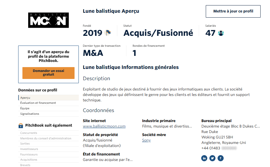 En tout cas, la société de services financiers Pitchbook a publié une entrée sur Ballistic Moon. Sur la page, il est indiqué que Ballistic Moon’s a été fondée en 2019 et compte actuellement 47 employés. Cependant, un détail supplémentaire à noter est que son statut de propriété est étiqueté comme « acquis/fusionné » – avec sa société mère étiquetée comme Sony.