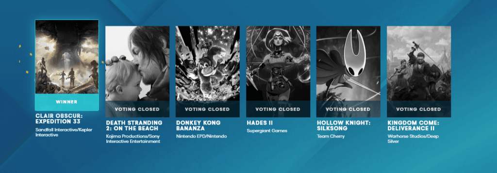 La performance d’Expedition 33 n’en est que plus impressionnante au regard des adversaires qu’il a dû affronter. La sélection finale rassemblait des poids lourds comme Death Stranding 2, Hollow Knight: Silksong, Hades 2, Kingdom Come: Deliverance 2 ou encore Donkey Kong Bananza. Des jeux acclamés, portés par des studios reconnus et des licences installées.