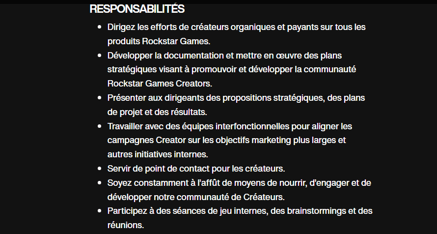 L’Associate Director sera également le principal point de contact entre Rockstar et les créateurs, qu’il s’agisse de vidéastes, de streamers ou de figures influentes de la scène GTA. L’objectif affiché est clair : structurer une stratégie cohérente autour des créateurs, tout en alignant ces initiatives avec les campagnes marketing globales de l’éditeur.