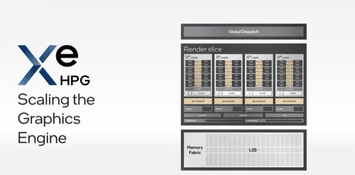 La base du Xe HPG est le Xe Core, qui a 16 unités vectorielles et 16 unités d’exécution de matrice Xe (XMX), et un cache L1. Intel combine quatre de ces cœurs Xe dans une tranche de rendu et ajoute un cache L2 partagé entre eux, ainsi qu’un cœur de traçage de rayons dédié pour chaque cœur Xe. Ce sont ces tranches qui séparent les différentes cartes Arc Alchemist.