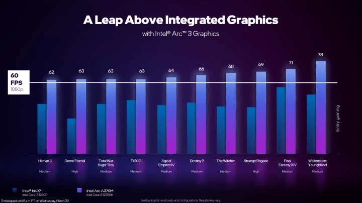 Intel a également partagé quelques benchmarks pour son A370M. Le graphique (ci-dessous) montre uniquement comment cette carte se compare aux anciens graphiques intégrés Intel, mais l’A370M a des fréquences d’images respectables. La carte était capable de gérer environ 60 fps dans des jeux exigeants comme Hitman 3 et Doom Eternal en 1080p, ce qui n’est pas anodin.