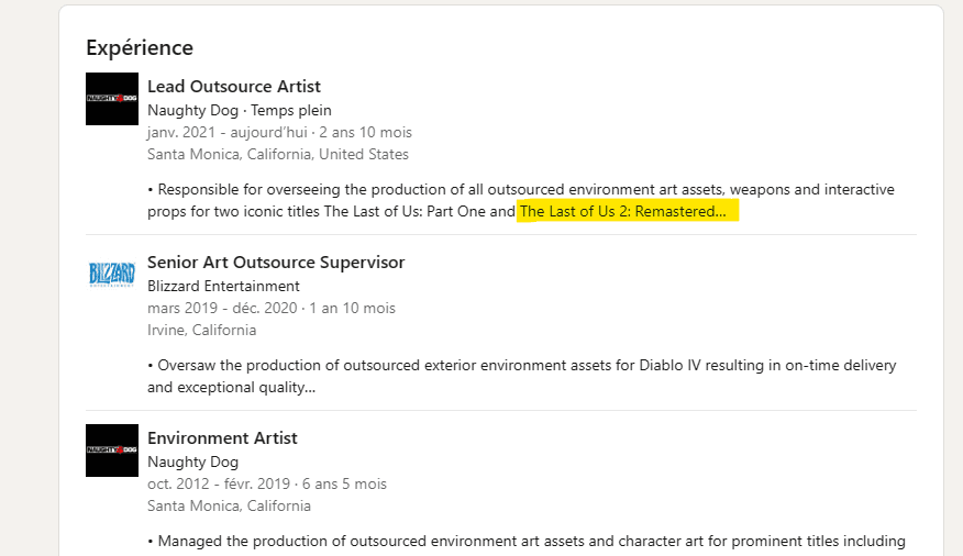 Le remaster a été repéré sur le profil LinkedIn de Mark Pajarillo, un Lead Outsource Artist de Naughty Dog. Le développeur travaille pour le studio depuis 2021, mettant en avant ses projets sur LinkedIn. Son profil LinkedIn indique qu’il a été responsable de deux projets, The Last of Us Part 1 et : « The Last of Us Part 2 Remastered ».