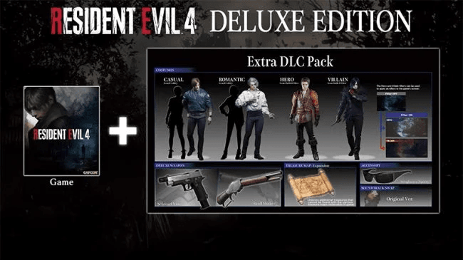 Resident Evil 4 Remake a également droit à quelques éditions spéciales. L’édition Deluxe est la première et la seule disponible en version numérique. Il comprend le jeu, quatre tenues pour Leon, deux tenues pour Ashley, deux filtres, deux armes de luxe, une carte au trésor, des lunettes de soleil de sport et la possibilité de passer à la bande son. Son prix n’a pas été annoncé.