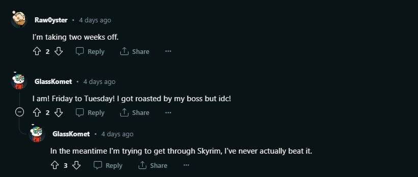 Un fil de discussion Reddit a été créé par u/thebutler97. L’utilisateur a pris une semaine de congé, sans regretter sa décision. Le message demande aux autres utilisateurs de Reddit qui ont fait de même, et les réponses confirment que u/thebutler97 n’est pas le seul.