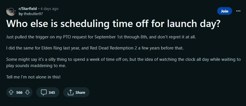 Un utilisateur réserve un jour férié pour le vendredi et le mardi. Combiné avec la fête du Travail le 4 septembre, cela donnera aux utilisateurs cinq jours de plaisir ininterrompu du jeu. Notamment, les fans de Starfield pourront profiter du jeu une semaine avant son lancement officiel le 6 septembre. Cependant, cela nécessite de pré-commander les éditions Premium ou Constellation.