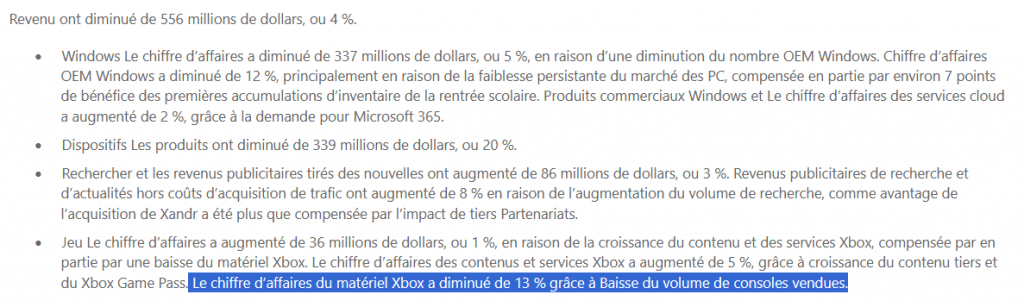 Alors que les ventes de consoles n’ont pas explosé, la Xbox a excellé dans d’autres domaines. Les revenus des jeux de Microsoft ont augmenté de 1 % (34 millions de dollars), tandis que les revenus du contenu et des services ont augmenté de 5 % en raison d’une augmentation du Game Pass et du contenu tiers.