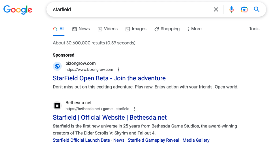 La nouvelle arnaque Starfield est simple, mais trompeuse. Elle incite les joueurs à participer à une fausse bêta avant la sortie de Starfield. Repérée à l’origine par PC Gamer, l’arnaque peut être trouvée via un lien sponsorisé sur Google, qui apparaît lorsque quelqu’un cherche Starfield. Le site web s’appelle « bizongrow dot com » et redirige l’utilisateur vers la page de « starfięld dot com », qui utilise l’accent pour confondre les victimes potentielles. Sur cette deuxième page, le joueur peut trouver un bouton pour télécharger la démo, qui installera probablement un logiciel malveillant à la place. Il est évident que les joueurs ne doivent pas cliquer sur ce lien. Le site web qui héberge l’escroquerie a été enregistré au début du mois d’avril, et il est en ligne depuis plus d’une semaine. À l’heure où nous rédigeons ce rapport, il n’a toujours pas été supprimé.