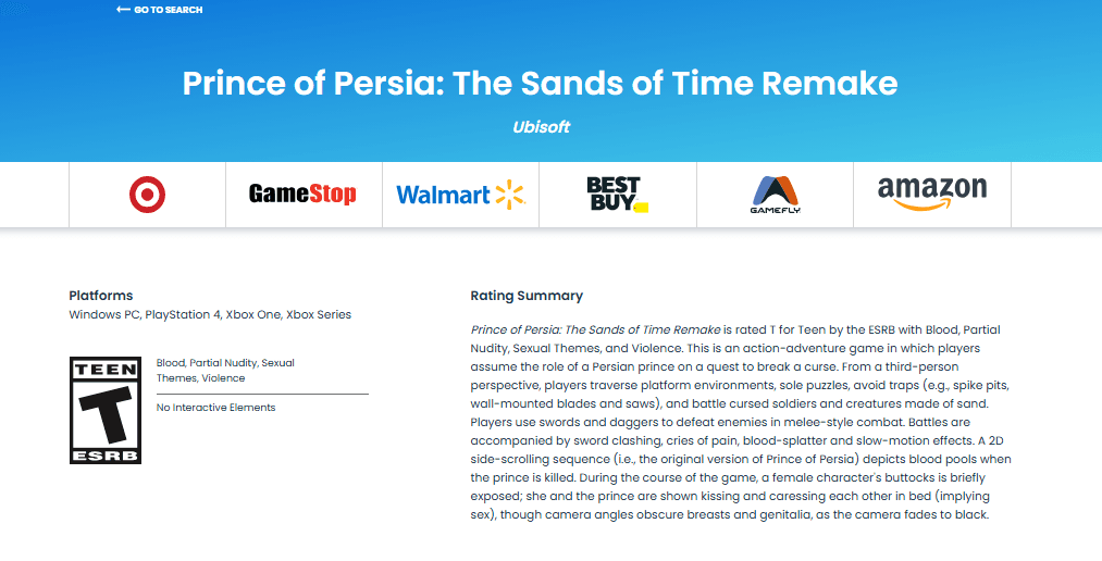 Selon le résumé de l’ESRB, Les Sables du Temps Remake hérite d’une classification Teen, avec la présence de violence, sang, nudité partielle et thèmes sexuels. Le jeu est décrit comme une aventure d’action à la troisième personne dans laquelle les joueurs incarnent le Prince, engagé dans une quête visant à briser une malédiction liée aux mythiques Sables du Temps.