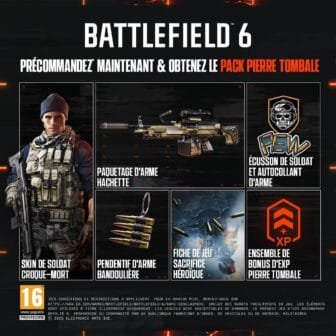 En précommandant Battlefield 6 avant le 10 octobre 2025, vous avez la chance de recevoir un pack exclusif appelé le pack Pierre Tombale. Ce pack comprend de nombreux objets personnalisés tels que le skin de soldat Croque-Mort, une fiche de jeu de sacrifice héroïque, et bien plus encore. Profitez d’un bonus d’expérience de carrière afin de donner un coup de pouce à votre progression dès le début du jeu.