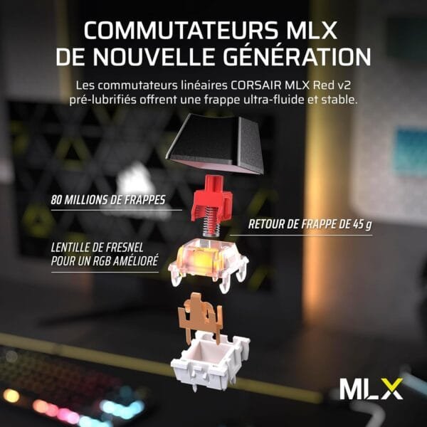 Effectuez des frappes fluides et stables grâce aux switchs de touche linéaires prélubrifiés CORSAIR MLX Red v2, le tout avec un éclairage RGB par touche ultralumineux. L’expérience de frappe avec le K70 CORE TKL WIRELESS est inégalée grâce aux deux couches d’insonorisation qui offrent une sensation et un son incroyablement satisfaisants.