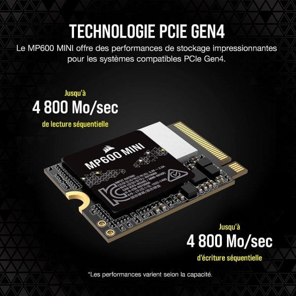 Le disque SSD M.2 NVMe PCIe Gen4 x4 CORSAIR MP600 MINI offre des performances de stockage exceptionnelles pour sa taille. Le format M.2 2230 ultra-compact est idéal pour les appareils fins et légers et convient parfaitement aux consoles Steam Deck