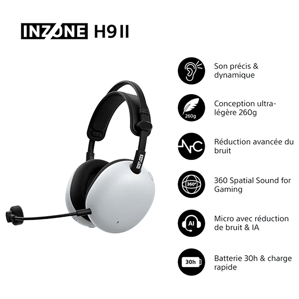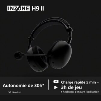 Le Sony Inzone H9 II est un casque gaming haut de gamme, conçu en collaboration avec Fnatic pour répondre aux exigences des compétitions. Il intègre les mêmes transducteurs que le casque WH-1000XM6, offrant une qualité audio exceptionnelle et une réduction de bruit active performante. Avec un poids réduit d’environ 260 g et un arceau confortable, il est parfait pour les longues sessions de jeu.