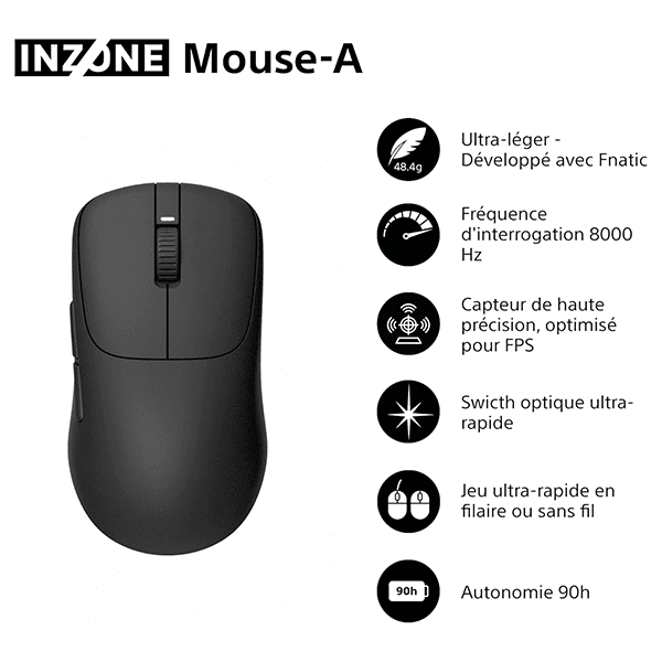 La Sony INZONE Mouse-A est une souris gaming pensée pour la compétition et l’eSport. Grâce à son capteur Sony 26 000 DPI, elle offre une précision chirurgicale, idéale pour les FPS et MOBA. Son poids plume et son design ambidextre garantissent une prise en main confortable, même lors des sessions prolongées.