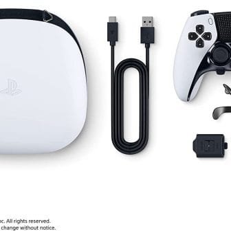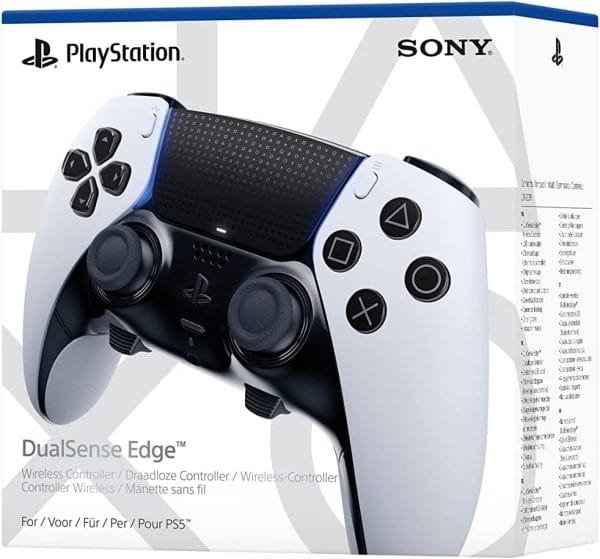 Manette sans fil DualSense, Edge Câble USB tressé, 2 capuchons de joystick Standard (attachés à la manette), 2 capuchons de joystick dôme haut, 2 capuchons de joystick dôme bas, 2 touches arrière demi-dôme, 2 touches arrière levier, Boîtier de connexion, Boîte de transport, Manuel d’utilisation.