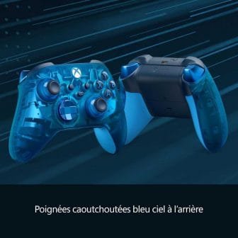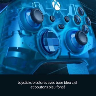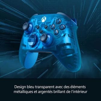 Révèle les mystères de la manette sans fil Xbox – Édition spéciale Sky Cipher, avec son design bleu transparent, son intérieur argenté, ses éléments métalliques et bien plus encore. Regarde au travers du boîtier et des gâchettes latérales bleu ciel pour voir les composants métalliques et argentés briller de l’intérieur.