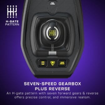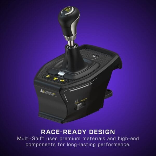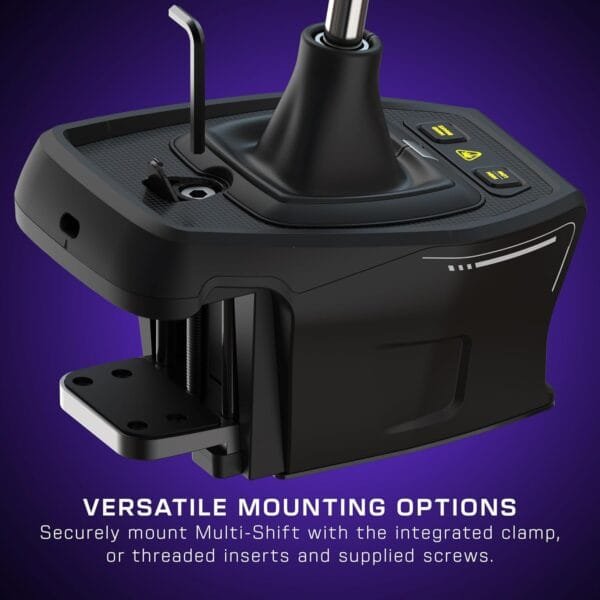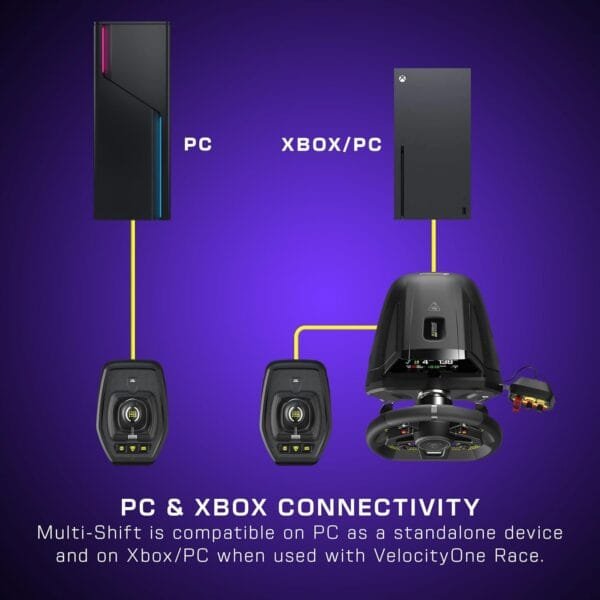 Le bouton Haut/Bas vous permet d’attribuer chacune des 7 positions de vitesse avant à une autre vitesse, l’idéal pour les simulations à la ferme ou de camion où le véhicule ont généralement plus de vitesses. Le Multi-Shift est plug-and-play sur PC en tant qu’accessoire autonome, ou sur les consoles Xbox via le volant VelocityOne Race.