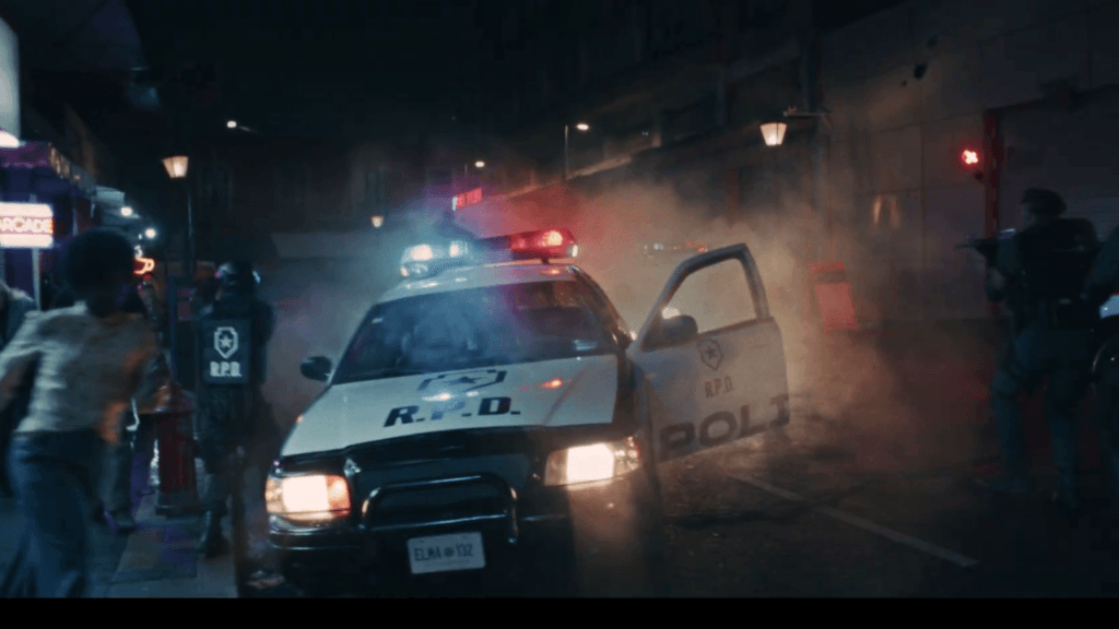 La mise en scène bascule alors dans l’horreur pure. Cris paniqués, rues envahies de zombies, forces du Raccoon City Police Department tentant désespérément de contenir l’effondrement, explosions en arrière-plan… Capcom enchaîne les images iconiques, rappelant les heures les plus sombres de la série. Plusieurs plans marquent durablement, notamment celui où la mère semble fracasser le crâne d’un infecté, ou encore cette séquence tendue où le duo se tapit dans l’ombre pour échapper à un Licker, avant que la situation ne dégénère brutalement.