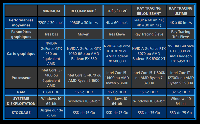 Vous trouverez ci-dessous une liste des spécifications minimales et recommandées, compilées par PlayStation, ainsi que des détails sur les spécifications Very High, Amazing Ray Tracing et Ultimate Ray Tracing.