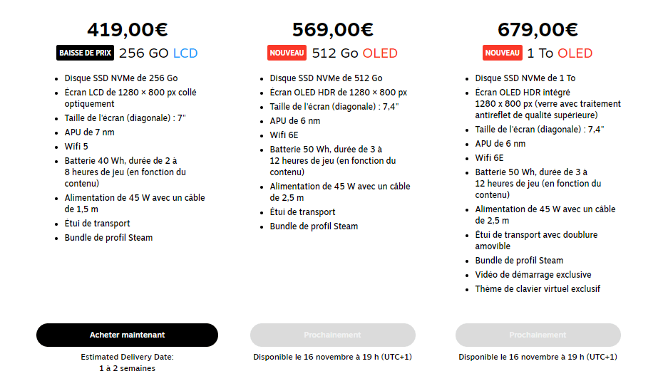 Les deux modèles sont actuellement disponibles en précommande sur la page de la boutique Steam Deck, une date de sortie a été fixée au 16 novembre. La page présente également un modèle OLED de coloris unique, singulièrement dédié aux États-Unis et au Canada.