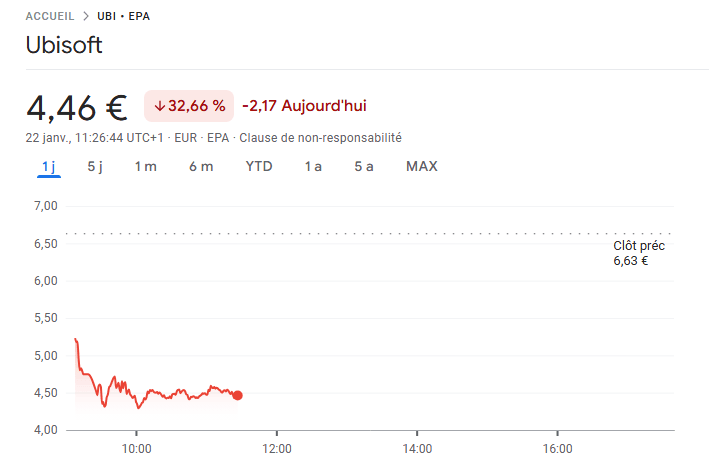Si cette baisse venait à se confirmer, il s’agirait tout simplement de la plus forte chute journalière du cours d’Ubisoft depuis son introduction en Bourse en 1996. Un signal particulièrement alarmant pour un éditeur déjà fragilisé sur le long terme.