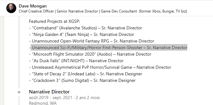 Une découverte récente laisse entendre que Xbox développerait actuellement un jeu de tir à la première personne orienté horreur. L’information provient du profil LinkedIn de Dave Mongan, ancien Senior Narrative Director chez Xbox Game Studios, un poste qu’il a occupé pendant plus de dix ans.